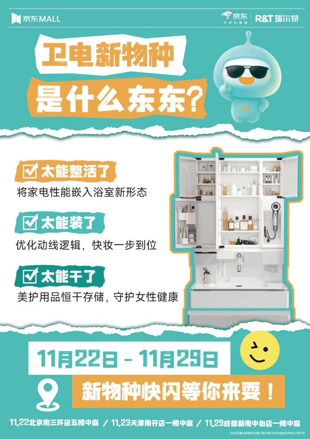继北京站新品发布会圆满落幕,这场由瑞尔特与京东强强联动打造的限定快闪活动将开启双城接力:11月23日登陆京东MALL天津南开店,11月29日亮相京东MALL成都新南中心店,将为两地消费者带来全新的智能卫浴体验。
