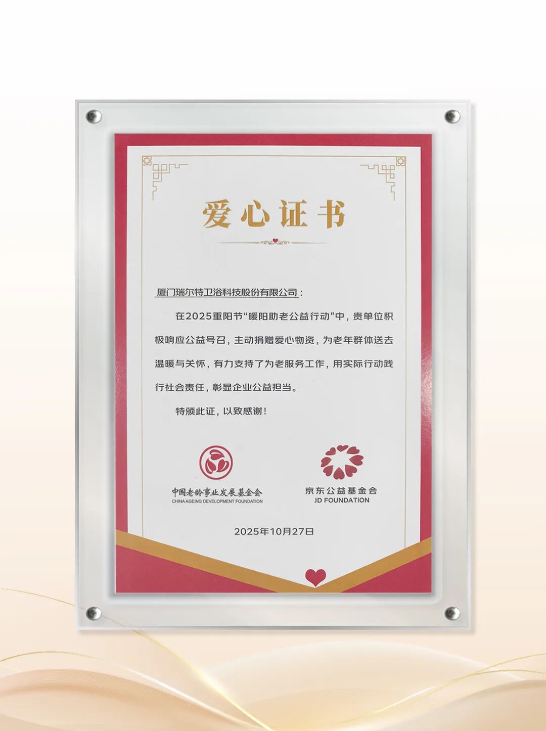 10月27日,以“安居暖阳,爱在日常”为主题的第六届“暖阳行动”发布会在京隆重举行。瑞尔特作为卫浴行业适老化领域的创新代表,受邀出席本次公益盛典,并郑重加入京东“暖阳行动”公益联盟,正式成为联盟核心伙伴。